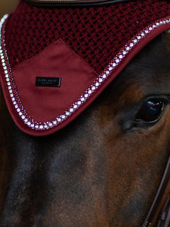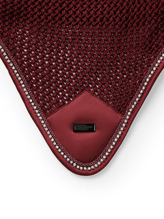 Luxurious crocheted ear bonnet in a stylish bordeaux color. Decorated with a tone-on-tone satin patch on the front, beautiful bordeaux and crystal piping and an Equestrian Stockholm badge in black. The ear net provides both insect protection and noise reduction. It has elastic cloth on the ears for extra comfort.