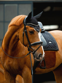 Luxurious crocheted ear bonnet in a stylish black color. Decorated with a tone-on-tone satin patch on the front, beautiful black and crystal piping and an Equestrian Stockholm badge in black. The ear net provides both insect protection and noise reduction. It has elastic cloth on the ears for extra comfort.